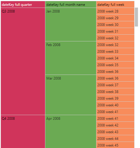 Users can create queries based on any of these new date/ time groupings, rather than relying on the original date-time column. As we see below, this makes date/ time analysis much more user-friendly and manageable. In the following grid, we can navigate between year, quarter, month, and date levels: