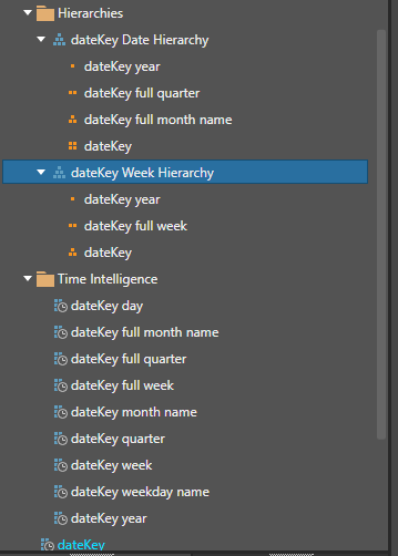 Hierarchies: the Time Intelligence automatically creates logical hierarchies from the date/ time columns and places them in the Hierarchies folder (red highlight below).