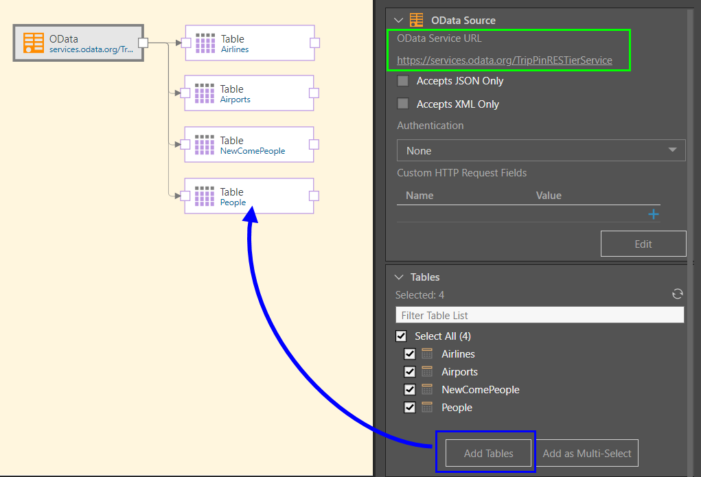 All tables from the source were added to the data flow (blue highlight) as table nodes.