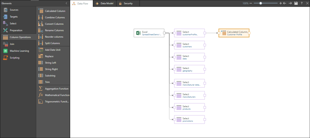 The Calculated Columns node enables users to manipulate columns during the data flow using a PQL script. Once the node has been connected to the relevant table, provide a PQL script in order to create or manipulate column values, or perform calculations on existing column values, and add these manipulations as an additional column.