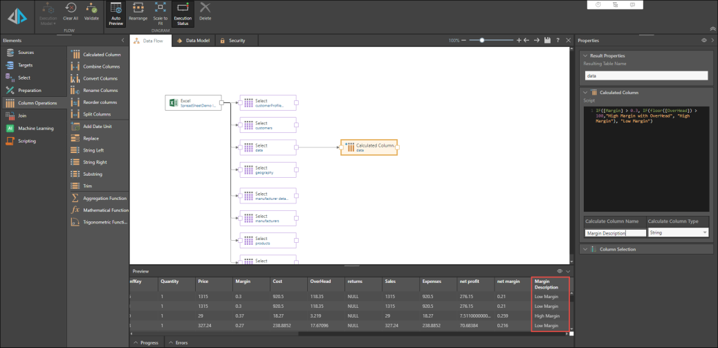 In this example, an If statement is entered into the script window, to generate a new column that will return a result of either High Margin or Low Margin, based on the Margin and Overhead columns. If the margin is greater than 0.3, the calculated column will return High Margin; if it's equal to or less than 0.3, it will return Low Margin: