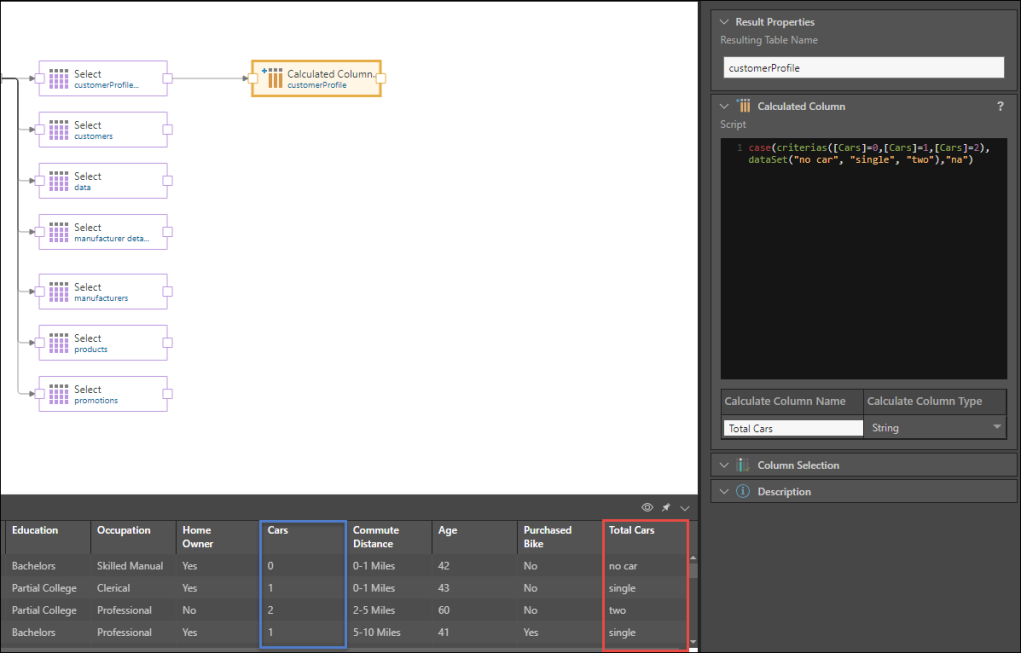 In this example, a column is added with the number of cars for each customer, based on the following statement: