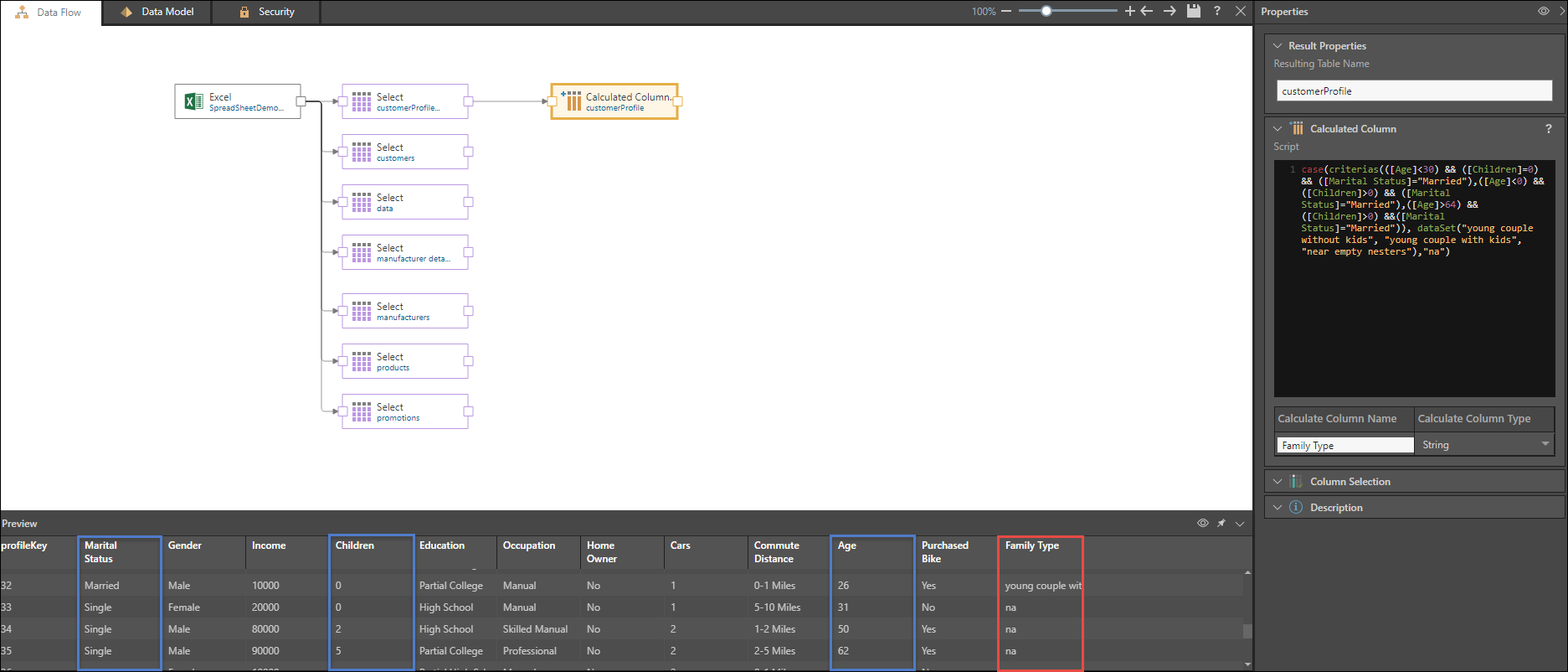 In this example, the statement will return a column with the following strings: "young couple without kids," "young couple with kids," "near empty nesters," or "na." The results returned will depend on combinations of the following criteria: age, number of children, and marital status.