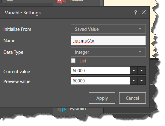 In this example, the variable is initialized when Income is $60,000: