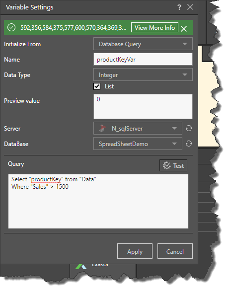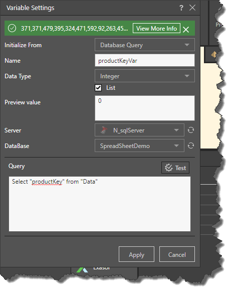 In this example, a Select expression was used to initialize the variable from a database query. The variable returns the productKey from the Data table: