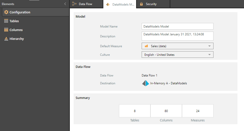 The summary displays some statistics about the data model. It displays the number of data sources used to create the data model, and the number of tables, columns, and measures in the data model.