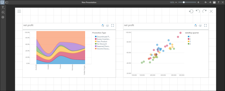 Fixed: a plain layout, with a grid that can be disabled. Visualizations can be placed anywhere on the canvas. Toggle the grid on and off from the Design ribbon.
