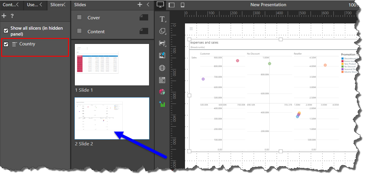 However, when Slide 2 is selected (blue arrow below) the Country slicer from Slide 1 appears in the Slicers panel (red highlight).