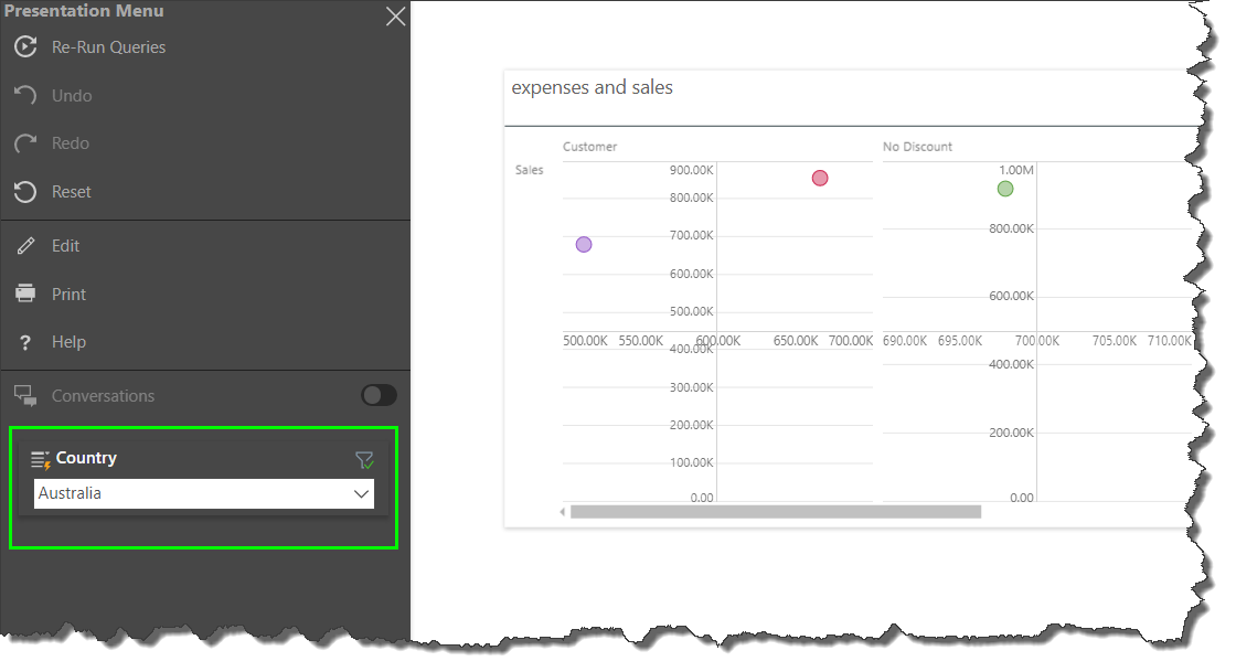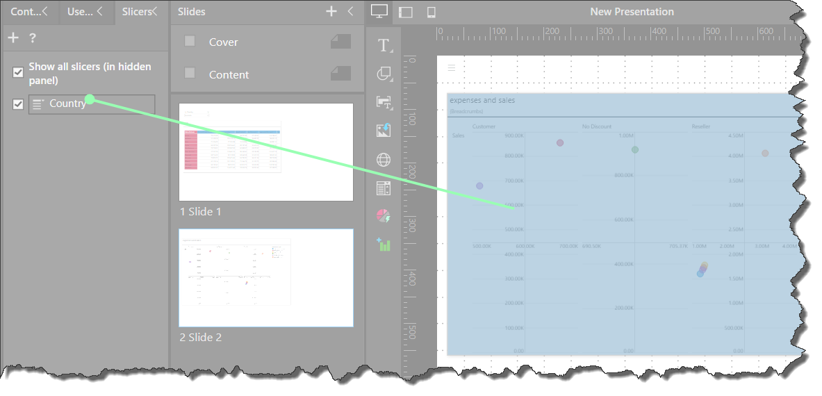 If required, you can add an interaction directly from the slicer in the Slicers panel to the visual on the selected slide. Adding an interaction in this way will create a hidden slicer when the presentation is rendered in runtime.