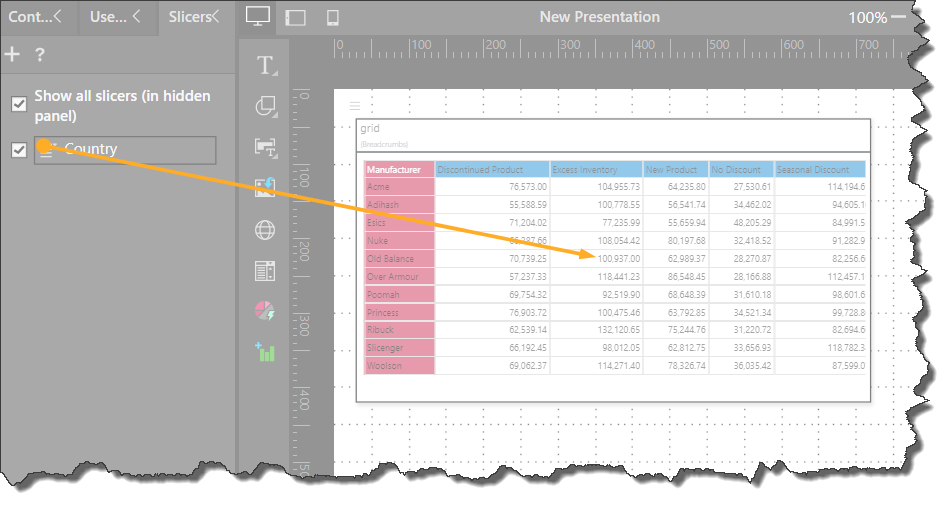 You may want to move a hidden slicer to the slide, rather than leave it in the hidden slicer panel. To do this, simply drag the hidden slicer from the slicer panel onto the slide. Drop the slicer onto the slide, and configure it as usual.