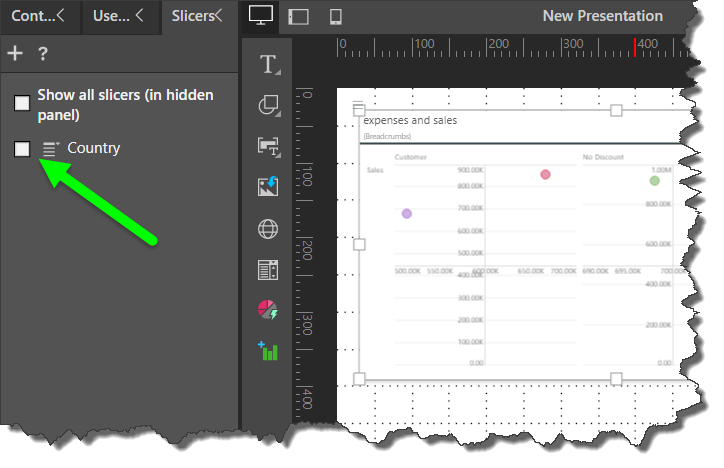 Hidden slicers are enabled for each slide by default, and they appear in the Presentation whether or not any interactions have been set. You can turn off a hidden slicer by deselecting it from the Slicers panel while the relevant slide is selected; in this scenario, the hidden slicer will not be rendered for the given slide when the presentation is launched in runtime.