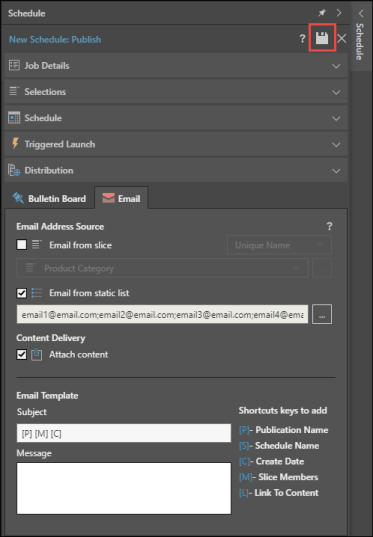 Your email distribution list will be loaded in the static list window. Click save to commit the schedule.