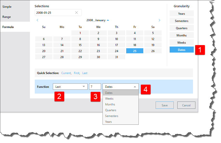 The Formula calendar picker supports the functional selections described below. You can also review detailed documentation about each of these functions here.