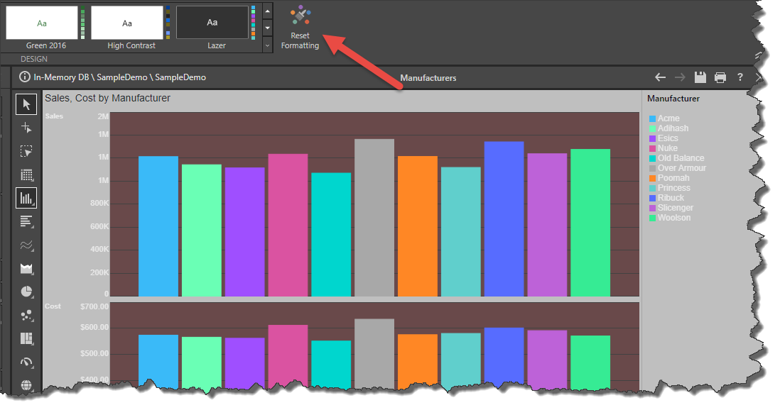 Formatting preferences override not only the current theme, but any subsequently selected theme in the current discovery. For instance, in this example the theme was changed from "Red" to "Lazer," and the formatting changes were preserved. To discard formatting changes and revert to the default formatting, click Reset Formatting from the Discover Ribbons.