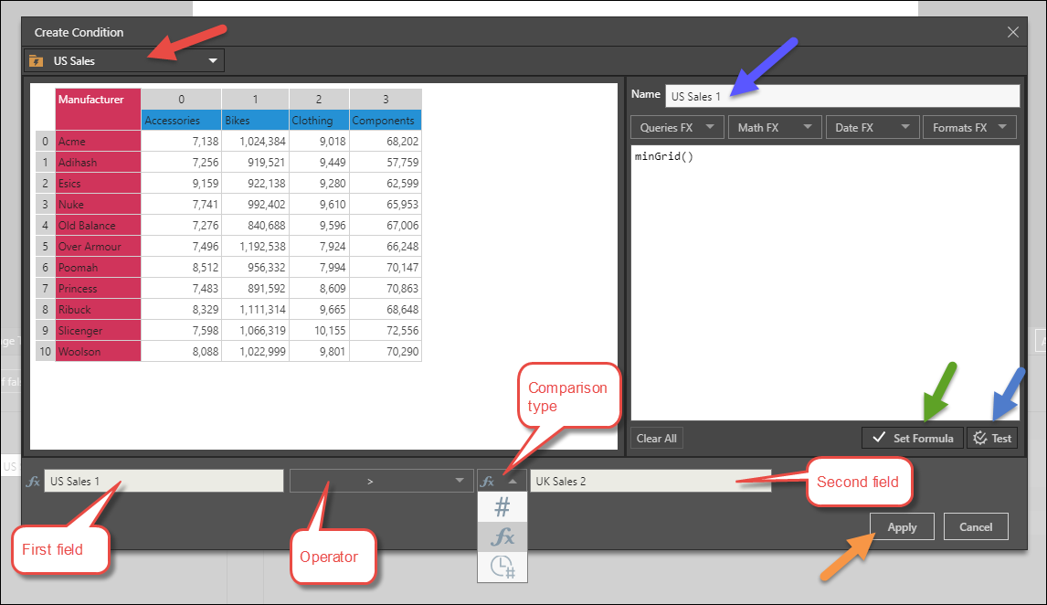 - If you've selected compare to dynamic function, find and select the required grid from the Content folders, and build the required formula. Test and click the green apply button. Click here for a list of dynamic functions.