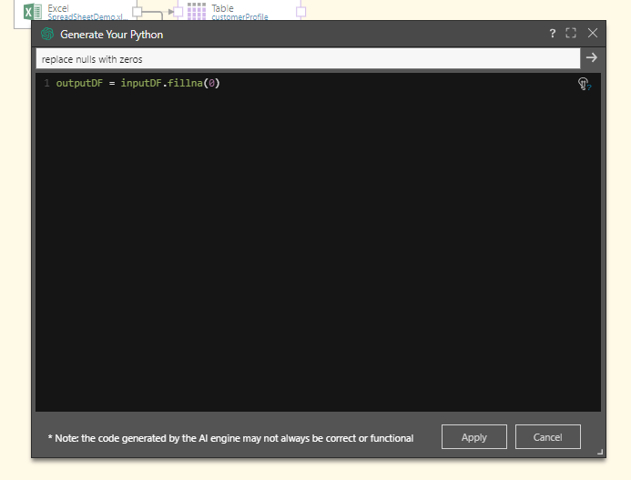 Pyramid's Generative AI integration lets you use AI to generate Python statements. This is useful if you want to generate code quickly, or don't know the syntax, for instance, To do this, click the Gen AI icon from the Properties panel. In the text field at the top of the Generate Your Python dialog, enter a description of the query you want to perform.