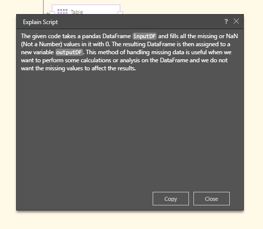 Opening the Explain Script dialog, we can see an explanation of the AI-generated Python script: