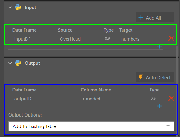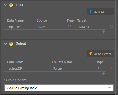When you download a script from the Marketplace, Pyramid automatically detects the inputs and outputs. When writing a script of choosing a shared script, you'll need to configure the input and output columns yourself. You also have the option to use to let Pyramid auto detect the output from the script.