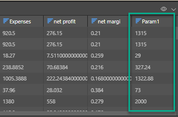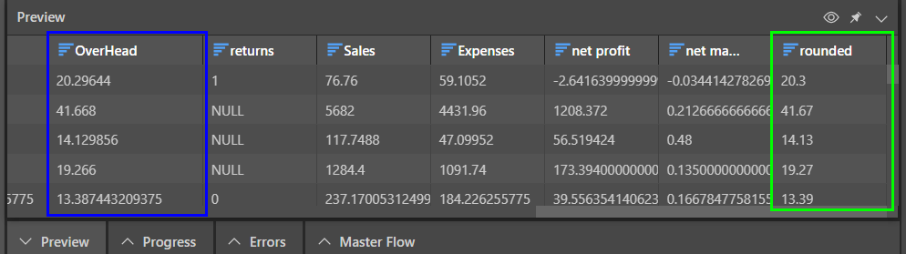 When the script is previewed, we see the table in the Preview panel. The original Overhead column (blue highlight below) is retained, and the new 'rounded' column is added (green highlight below):