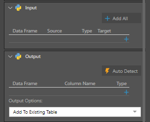 The input window is used to configure the column(s) that will be injected into the script. The output window is used to configure the new column(s) that will be produced by the script. You can also determine whether the new column(s) will be added to the existing table (the table to which the Python node is connected), or stored in a new a table.
