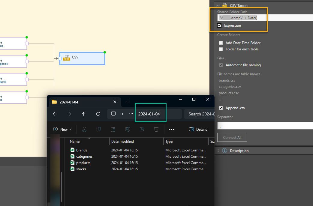 In this example, a dynamic PQL expression is provided to point to a shared CSV folder path to append the date to the file path.