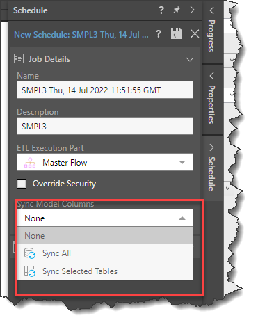 In the Job Details section, select SyncModelColumns. This is used to define the synchronization mode. There are three options: