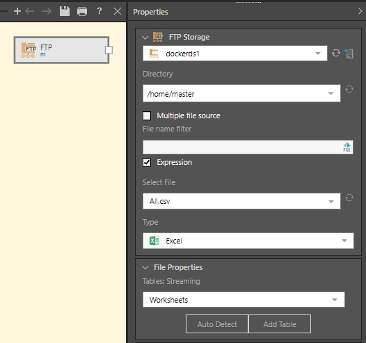 - Select file: select the file to be added to the Data Flow. If the 'Multiple file source' is enabled, all files in the given directory will be selected and listed in the Found Files window.