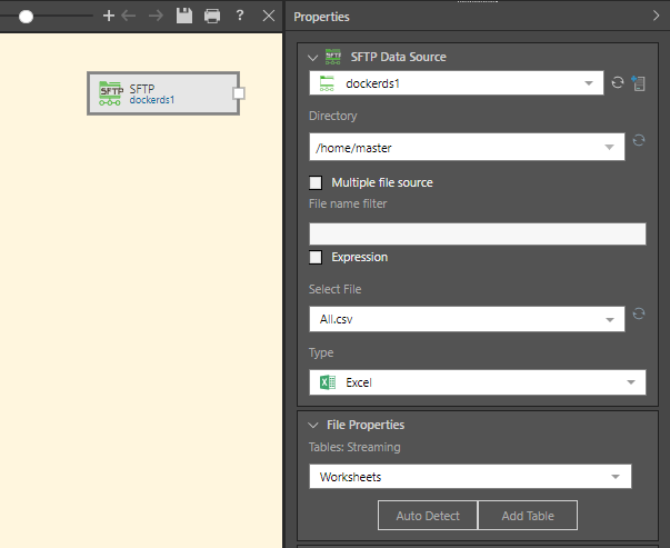 In this example, the SFTP node was added to the Data Flow and used to convert a .csv to table, using the Text file type: