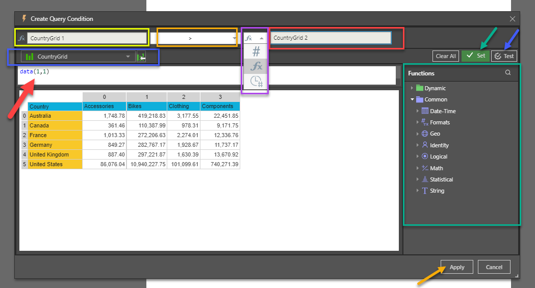 - If you've selected compare to dynamic function, find and select the required grid from the Content folders, and build the required formula. Test and click the green apply button. Click here for a list of dynamic functions.