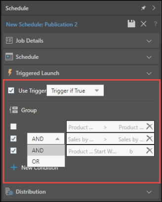 These conditions are set from the Triggered Launch panel of the publication and alerts schedulers, in the Create Condition dialog.