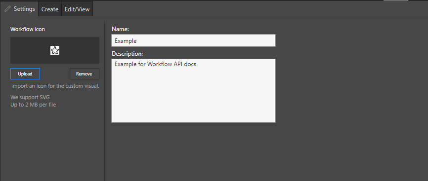 Start by adding the Workflow's Settings. Specify the Workflow's name and description and upload an icon for it.