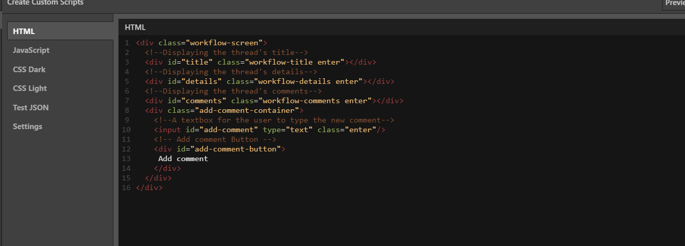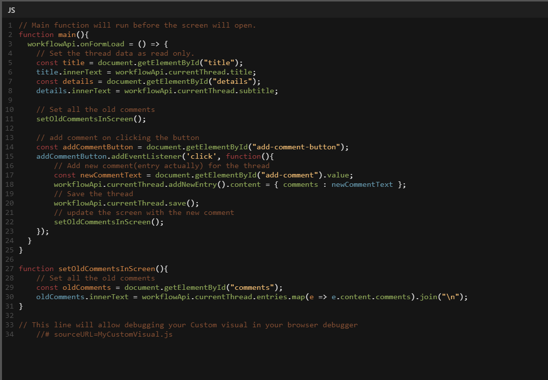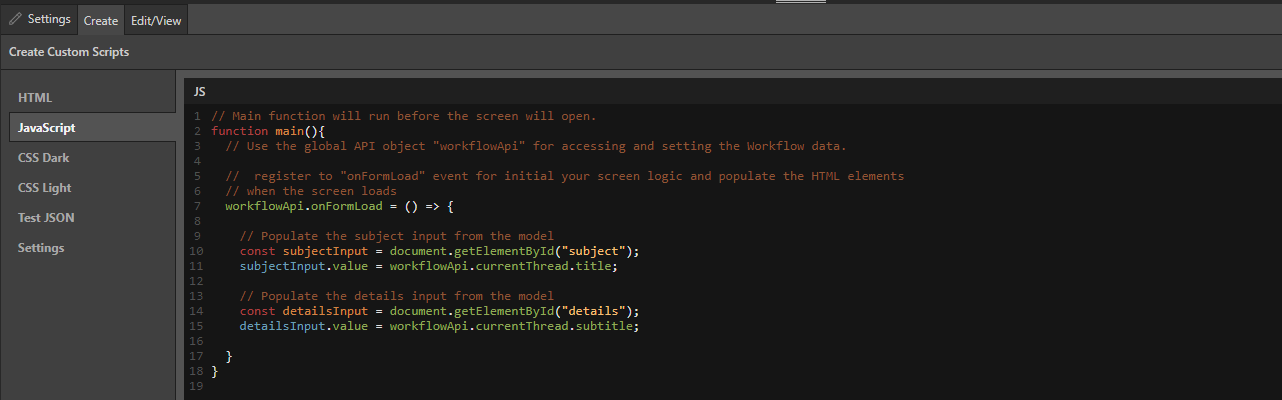 The "OnFormLoad" event triggers after the screen is loaded, so we can integrate it our HTML elements. Here we are using the API object, "workflowApi," to retrieve the thread's data, and set it in the HTML form input elements.