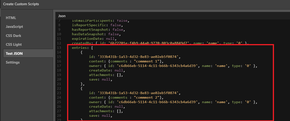 To test the "View/Edit" page we need to change the "Test JSON" to include some comments. We'll add elements to the "entries" attribute to represent the old comments.