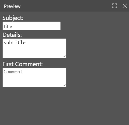 In our example, we'll add three inputs with labels, one for "subject", one for "description", and one for the "first comment":