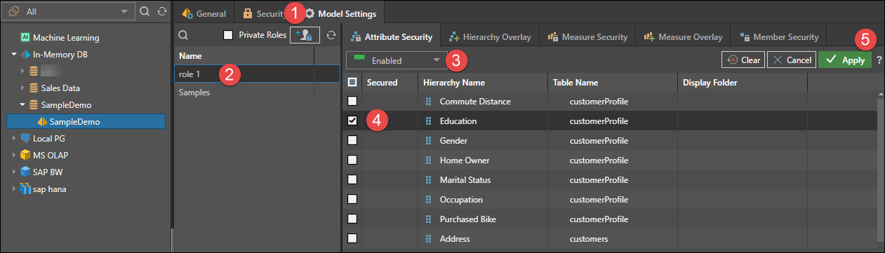 In the example below, the Education hierarchy is disabled for the Samples role; all other hierarchies will remain enabled for this role: