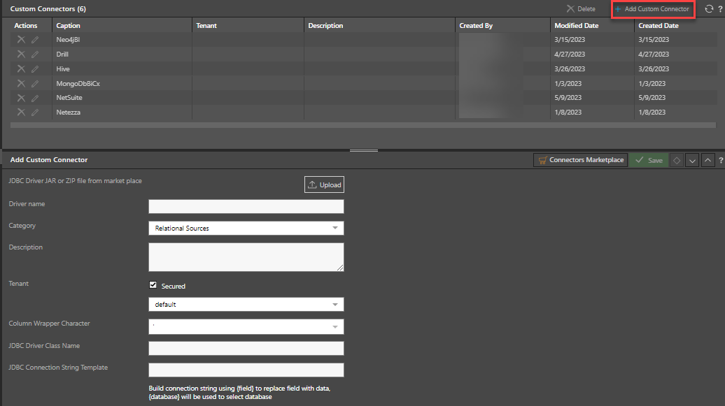 The Custom Connector manager allows admins to upload and configure the JDBC driver file (or package). This includes: