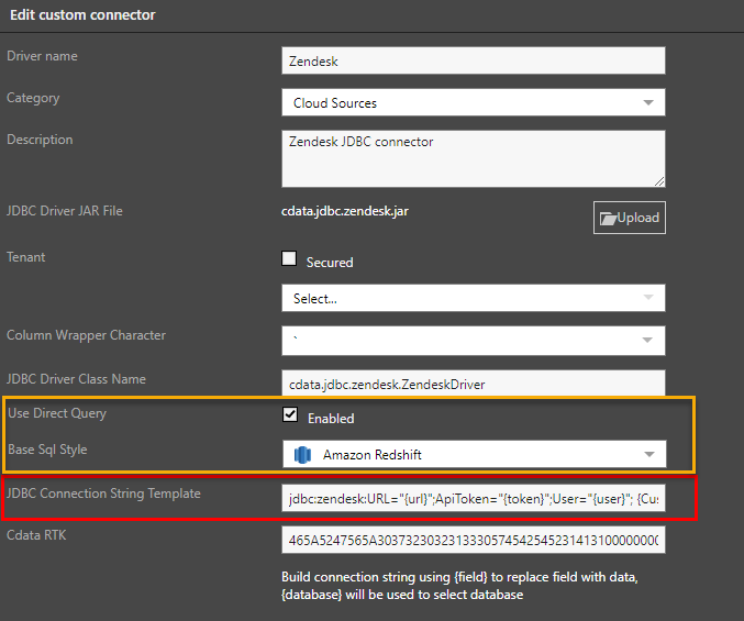 Each uploaded driver will have its own unique way of connecting to the data source. This is expressed through the connection string. As such a template for this connection string must be provided as part of the configuration (red highlight above). The connection string style should be provided by the JDBC's own documentation.