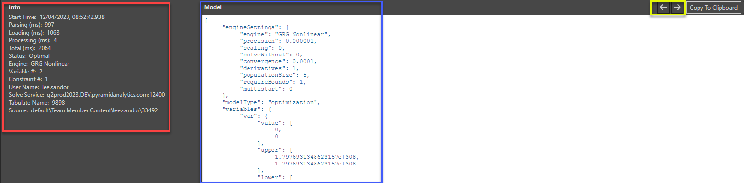 The bottom panel is broken into two sections: Info - basic transactional details (red box) and the Model section (blue box) that shows the Solve method as a JSON string.