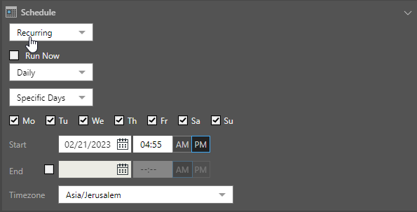 For each recurring schedule option, you must select a start date and time - this is when the schedule job will start running.
