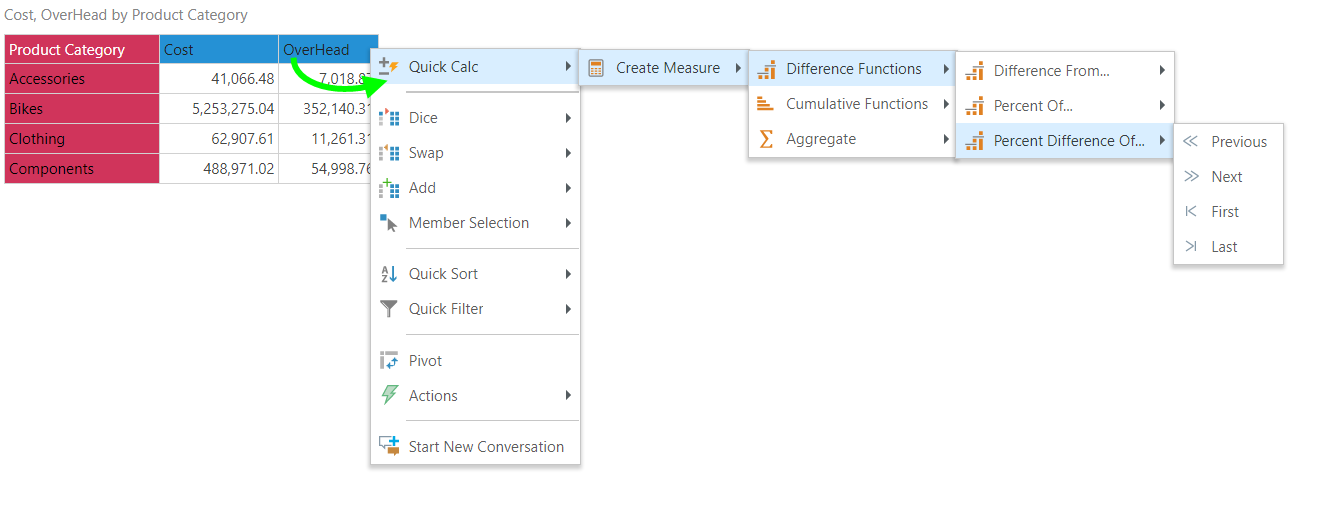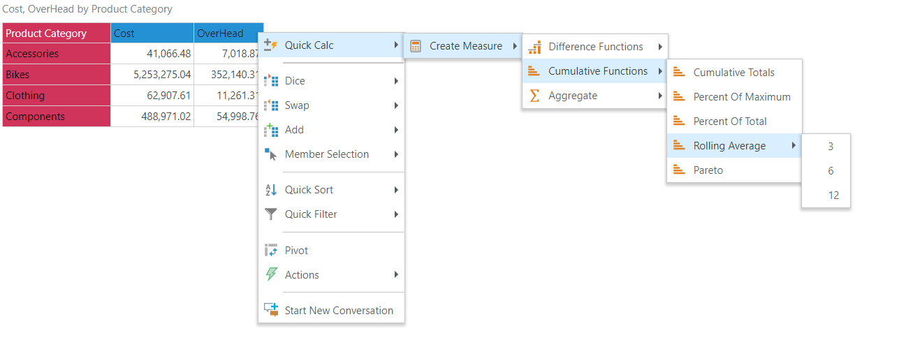 Context Calculations are exposed by right clicking on a measure in the query. This opens the context menu; the context calculations are located within the Quick Calcs sub-menu. Context calculations can also be exposed by right clicking on a measure in the drop zones.
