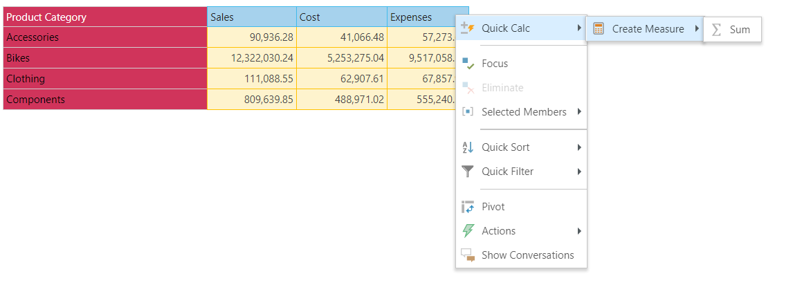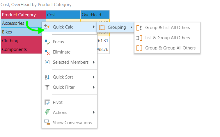 - Group + Group All Others: groups and aggregates the selected member elements into a single item and also groups and aggregates all the remaining elements into another single item. In the example below, the result would show the following 2 rows: 'Accessories, Bikes', and 'All Others'.