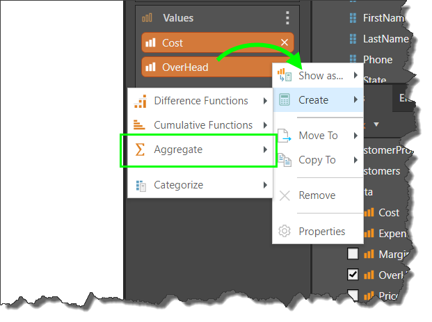 In this scenario, selecting the function from the 'Create' sub-menu will add the new aggregate value to they query, alongside the existing value. Choosing the 'Show as' sub-menu will replace the existing value with the new aggregate value.