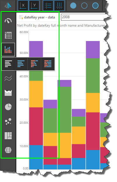 Pyramid offers dozens of visualizations to choose from, depending on the way in which you want to present your data. The process of choosing a visual is very straightforward in Smart Discover; simply choose the required visual from the Workspace Toolbox's Visualization Picker. For more information, see Discover Lite Workspace.