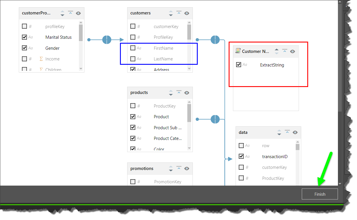 In this example, for the FirstName and LastName columns are hidden from the customers table (blue highlight). As usual, click the Finish button (green arrow) to process the model.
