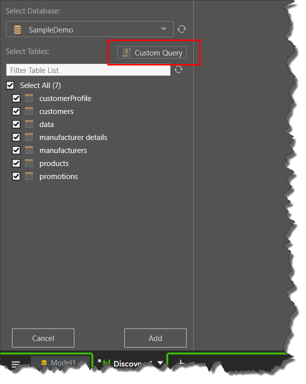 To add a custom table based on a SQL script, click the 'Custom Query' button from the table selection list:
