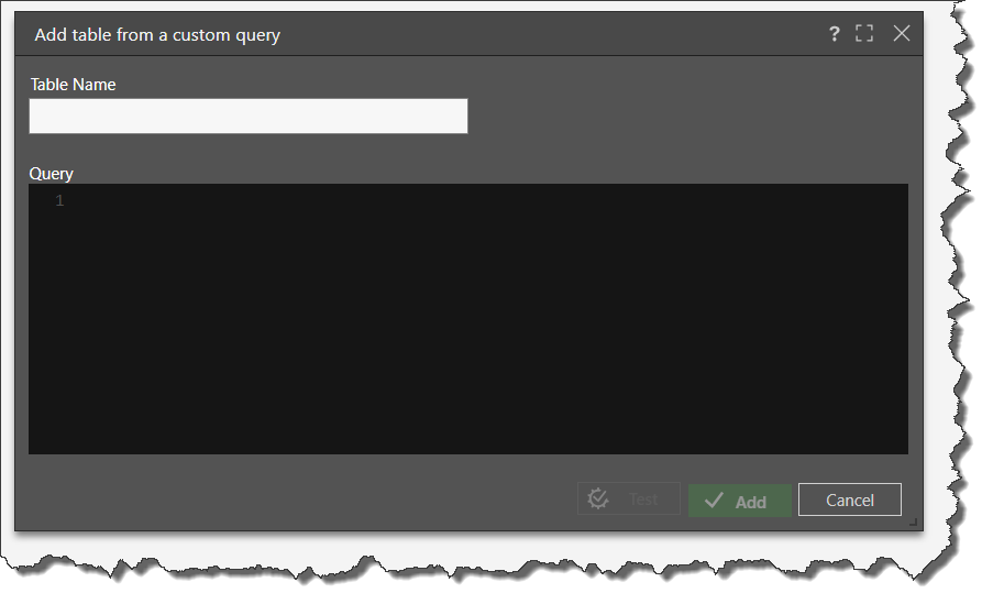 From the Custom Query dialog, enter a name for the table in the 'Table Name' field, and write your SQL script in the query editor. Test your script before clicking Add.