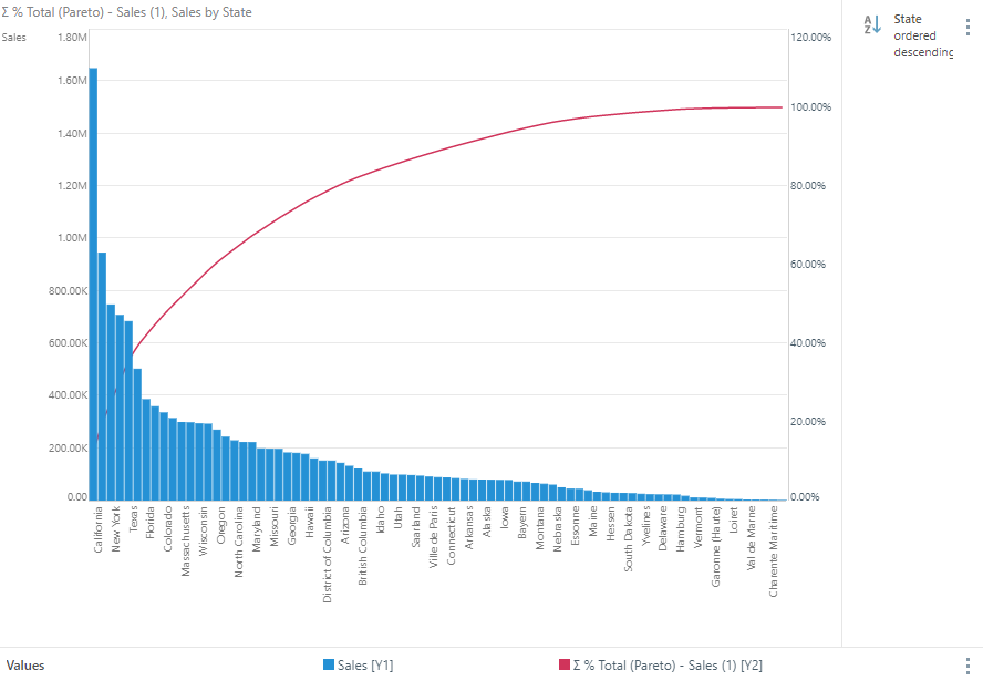 The Pareto function allows users to create a context calculation that accumulates a target metrics as a percentage across a range of items or elements. The Pareto principle posits that often 80% of the output of a given system is produced by 20% of the input. As such, Pareto shows values in decreasing order of relative frequency - where the values on the left have the highest frequency and those on the right have the lowest. This makes a Pareto analysis a powerful tool in understanding which variables in a given system have the greatest cumulative effect on that system. While Pareto analysis is usually shown as lines in combo column charts, the function is materialized as a series of calculated values for each item in the data set and can be viewed in almost in visualization context - like any other measure.