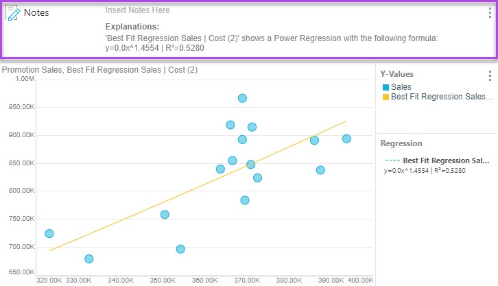 Applying a regression calculation to the query auto-generates an explanation in the Notes tool. This explanation describes how the regression was calculated; it contains the calculation name, the regression function used, the formula used to draw the regression, the R² value, and an explanation of what the R² value is (how closely the data matches the regression).