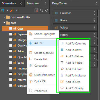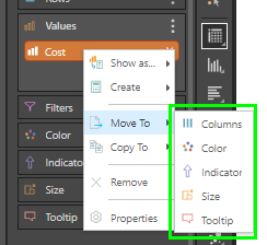 Add the same measure to multiple drop zones using the following techniques by drag and dropping it or using the Add To method (both listed above). You can also use the Copy To function from the context menu (as described below).