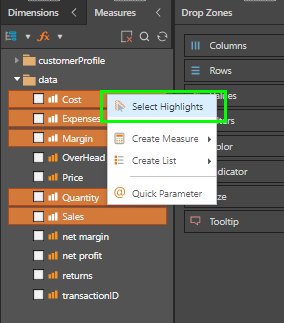 To add multiple measures at once, hold the Shift or Ctrl keys and then click on the measure caption (NOT the measure checkbox). The selected measures will be highlighted orange (as shown below). Right click on one of the highlighted measures and click Select Highlights.